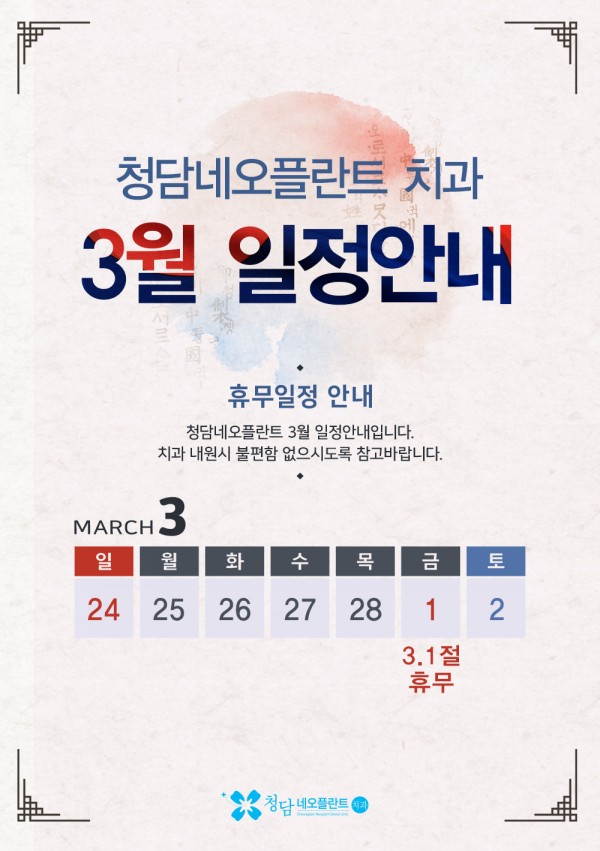 2019년 3월 청담네오플란트 진료일정 페이지 정보 작성자 최고관리자 작성일 19-02-28 11:38 조회 3,181회 댓글0건 관련링크 이전글 5월 진료일정안내 다음글 2019년 2월 청담네오플란트 진료일정 목록 답변 본문 2019년 3월 청담네오플란트 진료일정안내 댓글 목록 등록된 댓글이 없습니다. 댓글등록 이전글 5월 진료일정안내 다음글 2019년 2월 청담네오플란트 진료일정 목록 답변