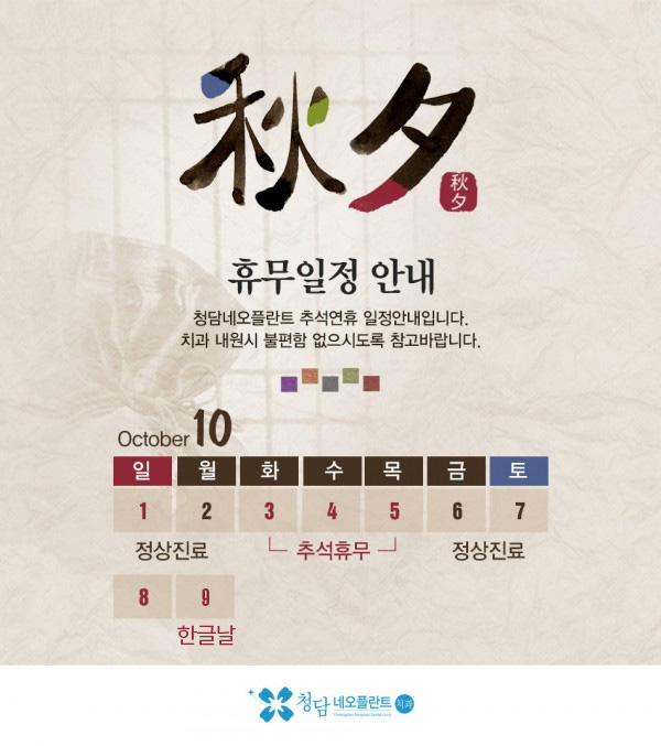 [휴무안내] 2017 청담네오플란트 추석휴무 안내입니다 페이지 정보 작성자 최고관리자 작성일 17-09-16 19:10 조회 3,358회 댓글0건 관련링크 이전글 [휴무안내] 2018 청담네오플란트 가정의달 휴무 안내입니다. 다음글 청담네오 플란트 입니다. 2017년 봄을 맞아 새로 홈페이지를 단장 했습니다. ^ - ^ )* 목록 답변 본문 [휴무안내] 2017 청담네오플란트 추석휴무 안내입니다 댓글 목록 등록된 댓글이 없습니다. 댓글등록 이전글 [휴무안내] 2018 청담네오플란트 가정의달 휴무 안내입니다. 다음글 청담네오 플란트 입니다. 2017년 봄을 맞아 새로 홈페이지를 단장 했습니다. ^ - ^ )* 목록 답변
