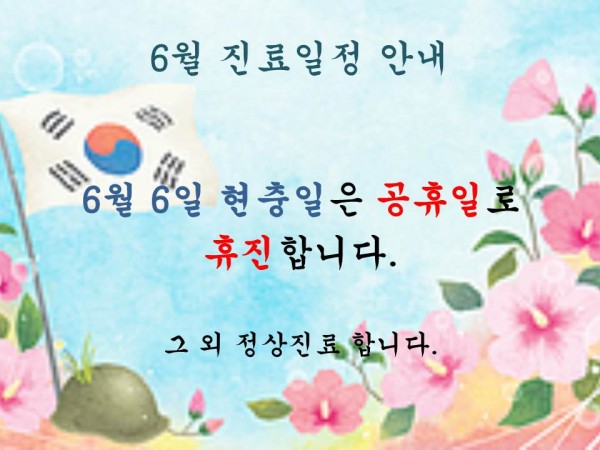 6월 진료일정 안내 페이지 정보 작성자 최고관리자 작성일 19-05-21 14:16 조회 3,282회 댓글0건 관련링크 이전글 추석연휴진료일정안내 다음글 5월 진료일정안내 목록 답변 본문 6월 진료일정안내해드립니다. 댓글 목록 등록된 댓글이 없습니다. 댓글등록 이전글 추석연휴진료일정안내 다음글 5월 진료일정안내 목록 답변