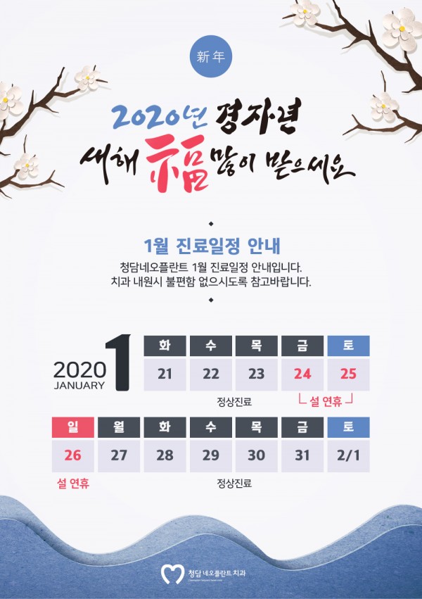 청담네오플란트치과2020년 1월 진료일정안내 페이지 정보 작성자 최고관리자 작성일 19-12-27 10:19 조회 3,313회 댓글0건 관련링크 이전글 신종 코로나바이러스 안내드립니다. 다음글 10월 휴진일정 및 진료일정 안내 목록 답변 본문 구정연휴는 1월24일 금요일~26일 일요일까지만 휴진입니다. 27일 월요일은 정상진료입니다. 감사합니다. 댓글 목록 등록된 댓글이 없습니다. 댓글등록 이전글 신종 코로나바이러스 안내드립니다. 다음글 10월 휴진일정 및 진료일정 안내 목록 답변